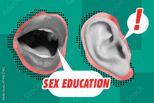 Sex education creative collage with speech bubbles, female lips and human ear against teal background