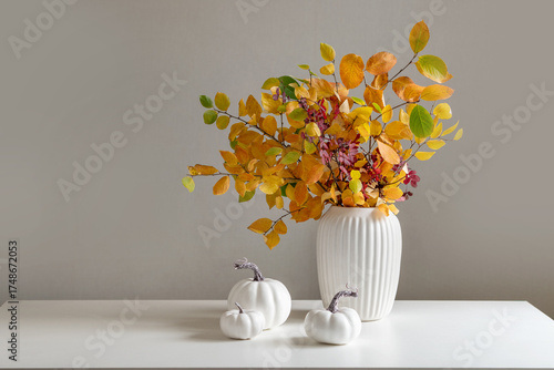 Bouquet of dry colorful red and orange fall leaves and branches in white vase and pumpkins on white table. Minimal modern composition. Autumn season. Home interior and season decoration.