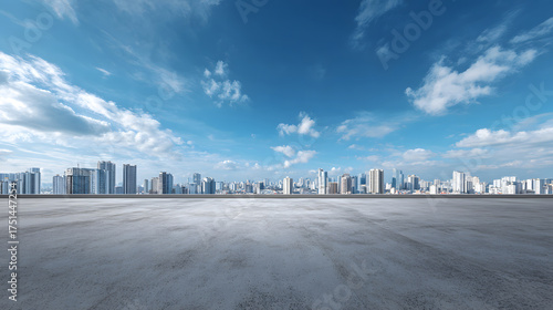 Expansive Concrete Plaza with Modern City Skyline Under Blue Sky