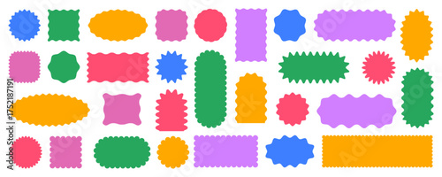 Colorful rectangular square, round oval forms with scalloped borders, squiggly wavy textboxes frames