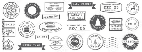 Christmas postmark and mail stamp collection in vintage monochrome. Various postal marks with north pole, santa, and delivery dates. Suitable for retro card design and holiday decoration