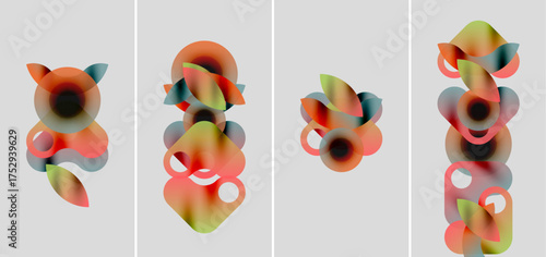 Abstract colorful shapes overlap, creating dynamic compositions. Soft gradients blend hues, forming fluid forms. Minimalist presentation, four panels.