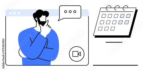 Man in video call window thinking about scheduling or planning, with speech bubble and calendar. Ideal for remote work, time management, decision-making, communication, scheduling, planning, online