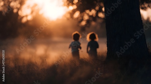 Two children silhouetted in a field during a warm hazy golden hour sunset