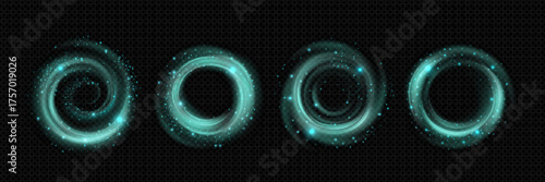 Magical wind effects with swirl patterns, vortex shapes and sparkle particles for fantasy design. Turquoise energy rings on black transparent background. Portal circles and cosmic dust for games.
