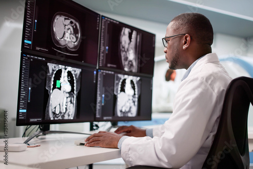 Skilled Surgeon Analyzing MRI Scan Using Desktop Computer