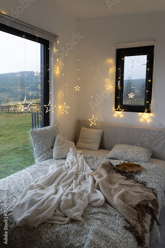 cozy bedroom detail and Christmas lights