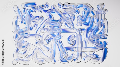 Abstract geometric maze structure made of glass tubes, isolated on white background. Blue objects are refracted through the transparent surfaces. 3D rendering illustration.