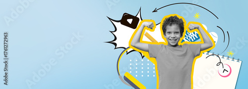 Bright and colorful collage showcases a smiling child flexing muscles against a light blue background. Dynamic graphic elements add energy and joy to the scene, creating a playful atmosphere.
