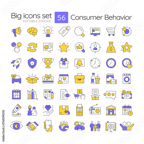 Consumer behavior line color icons set. Time management, target audience. Customer experience. Accounting, banking. Vector illustrations. Simple flat colorful symbols collection. Editable stroke