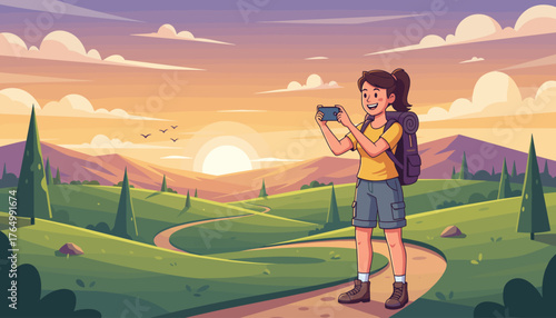A young female tourist with a backpack joyfully captures a breathtaking sunset landscape with her smartphone, standing on a winding path amidst rolling green hills and evergreen trees, under a