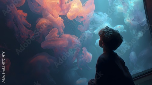 Young boy gazes in awe at glowing pink and blue jellyfish in dark aquarium tank child watching