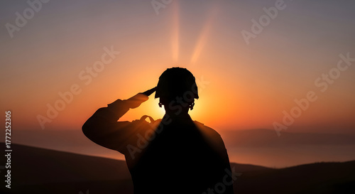 Silhouette of a soldier saluting against a vibrant sunset, honoring service and sacrifice.