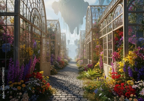 Illustration of fantasy garden with greenhouses, flowers, and floating island in the sky