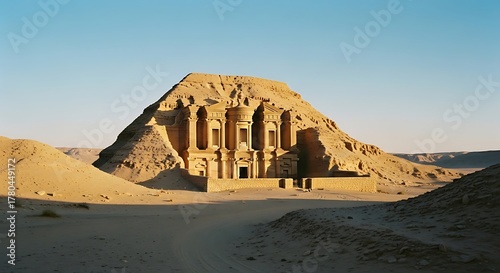 Ancient Egyptian Temple Carved into Sandstone Cliff in Desert.