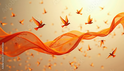 International Day for the Elimination of Violence against Women. Flying birds with a joyful mood among orange ribbons in an abstract background