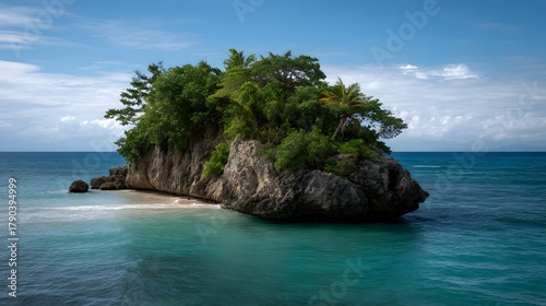 A small tropical island with lush green vegetation and rocky cliffs emerges from clear turquoise ocean waters under a blue sky