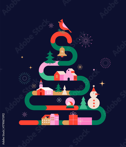 Merry Christmas and Happy New Year 2026 template. Christmas tree in modern minimalist geometric style.