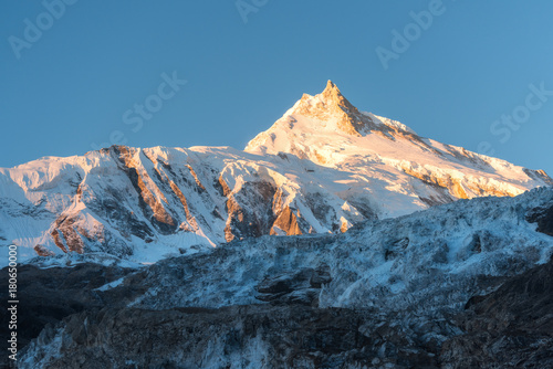 Beautiful view of snow-covered mountain at colorful sunrise in Nepal. Landscape with snowy peaks of Himalayan mountains, glacier and blue sky in the morning. Amazing Manaslu. Himalayas. Nature