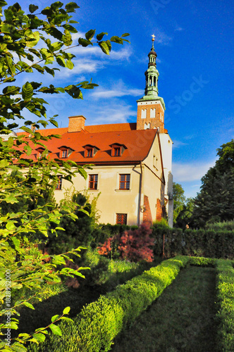 Zabytkowy kościół z czerwonymi dachami i wieżą otoczony zielonymi ogrodami pod błękitnym niebem. Lubiń - Klasztor Opactwa Benedyktynów.