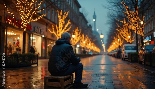 Elderly man sits alone on street bench in city against bright holiday lights. He looks sad and cold amid festive decorations, symbolizing loneliness during Christmas and social issues.