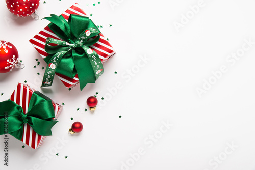 Merry Christmas and Happy Holidays greeting card, frame, border, banner. New Year. Red green Christmas decoration, ornaments and gifts, presents on white background. Xmas holiday festive theme.