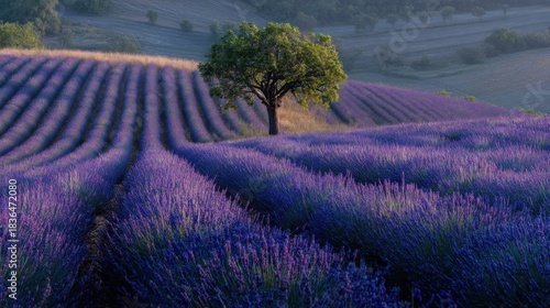 A large field of lavender with a single tree in the middle. The tree is surrounded by purple flowers and the field is full of them. The scene is peaceful and serene