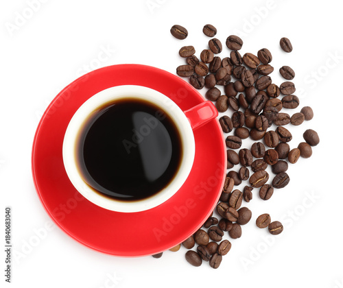 Aromatic coffee in cup and beans isolated on white, top view