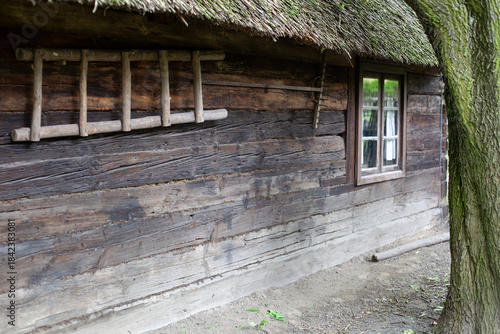 Stara drewniana wiejska chata z dachem krytym strzechą słomianą charakterystyczna kiedyś dla polskiej wsi