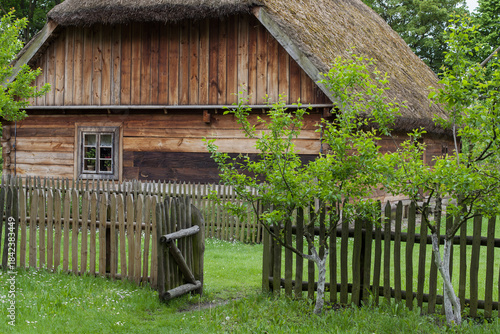 Stara wiejska drewniana duża chałupa z dachem krytym strzechą słomianą otoczona drewnianym płotem