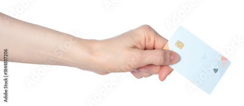 Hand holding a bank card with a chip, isolated on transparent background. Ideal for finance, payment, banking, digital transactions, and security-themed projects