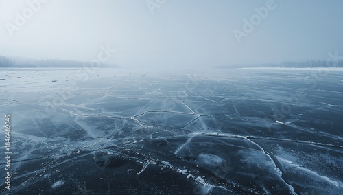 Spanning frozen lake surface revealing polygonal cracked ice toward misty horizon, with treeline
