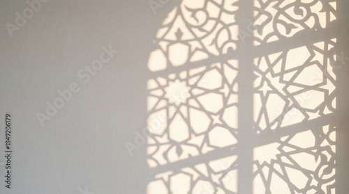 Abstract Minimalist Geometric Shadows Cast by Islamic Jali Screen on Plain White Wall during Golden Hour with Copy Space