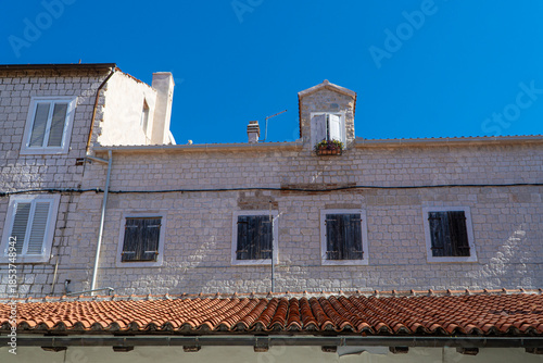 Stare zabytkowe kamienice i uliczki w mieście Trogir w Chorwacji z pięknymi oknami i okiennicami.