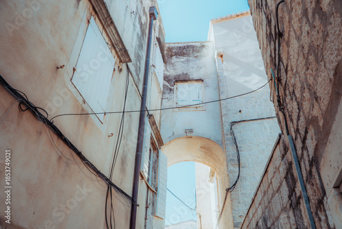 Stare zabytkowe kamienice i uliczki w mieście Trogir w Chorwacji z pięknymi oknami i okiennicami.