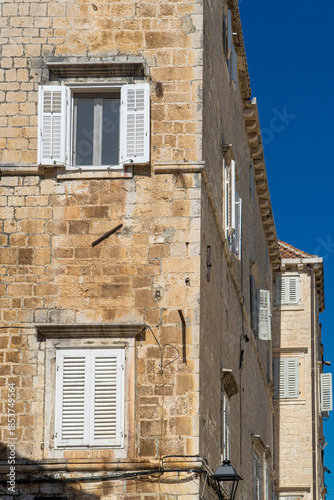 Stare zabytkowe kamienice i uliczki w mieście Trogir w Chorwacji z pięknymi oknami i okiennicami.