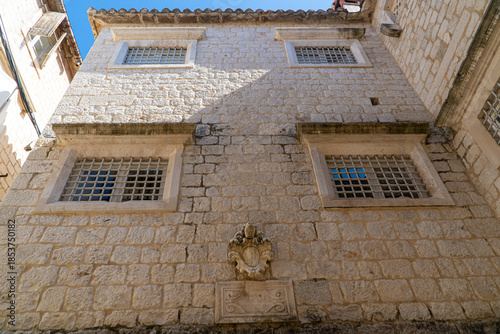 Stare zabytkowe kamienice i uliczki w mieście Trogir w Chorwacji z pięknymi oknami i okiennicami.