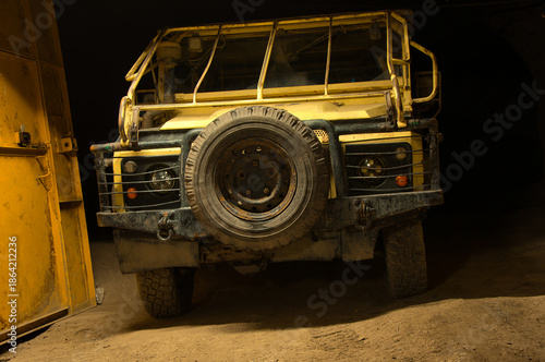 Zakurzony, wytrzymały, żółty samochód terenowy stoi nocą przy żółtej bramie garażowej, prezentując przedni grill, koło zapasowe i solidny zderzak.