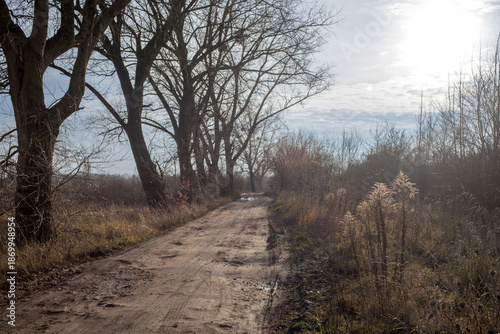 Typowy wiejski krajobraz z drogą gruntową i rosnącymi przy niej drzewami