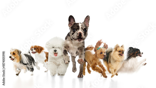Collage of mixed dog breeds running toward camera isolated on white background. Concept of pet food advertising, animal healthcare promotion, pet insurance visuals, and dynamic animal behavior.