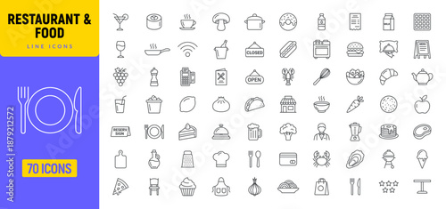 Restaurant food line icon set. Restaurant menu pizza beverage burger grill icons