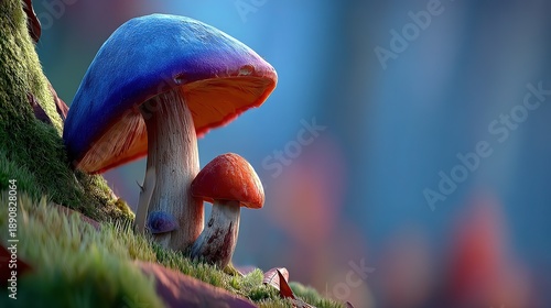 Fantasy game scene: 3D glowing mushrooms blue-orange luminescence mossy realm, depth bokeh magical flares, razor texture, ideal for RPG loading screen, indie game cover, virtual world concept