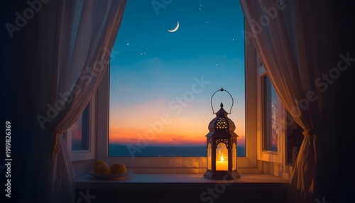Ramadan lantern on windowsill at dusk with crescent moon and stars visible outside