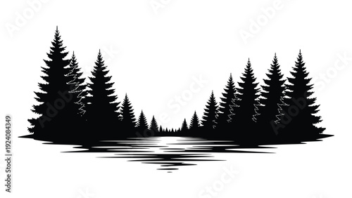 Serene lake scene with pine trees at sunset isolated on white background, Vector