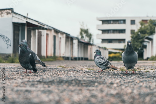 Grupa gołębi na żwirowym podłożu przed rzędem garaży i blokiem mieszkalnym. Autentyczny miejski pejzaż, przyroda w mieście i industrialny klimat w pochmurny dzień.