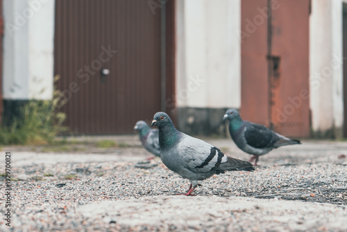 Grupa gołębi na żwirowym podłożu przed rzędem garaży i blokiem mieszkalnym. Autentyczny miejski pejzaż, przyroda w mieście i industrialny klimat w pochmurny dzień.