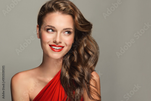 A slender and elegant woman with a beautiful smile. She is wearing a red dress and red lipstick. The girl's hair is styled in a wavy hairstyle. Curly hair, cosmetology, beauty, and makeup.