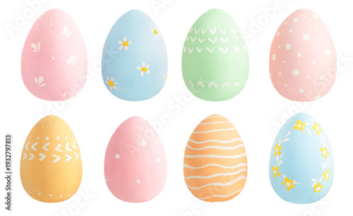 A collection of eight Easter eggs on a white isolated background