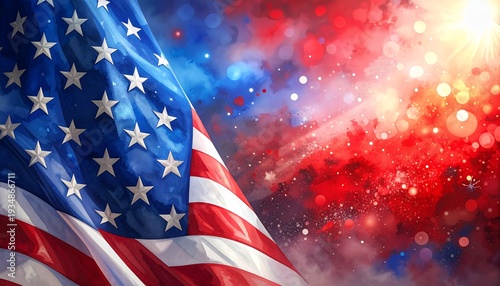 Dynamic, artystyczna kompozycja z powiewającą flagą USA na tle abstrakcyjnego, świetlistego nieba w barwach narodowych.