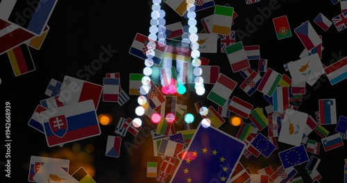 Floating flags overlapping on dark studio with vertical LED lights, showing EU Slovak Cyprus